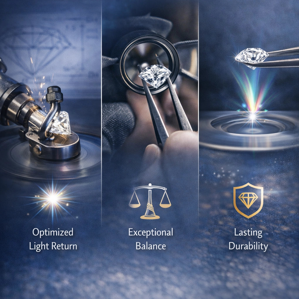 Each made-to-order diamond undergoes careful planning, expert polishing, and detailed inspection before delivery. We focus not just on appearance, but on maximizing light return, balance, and durability.