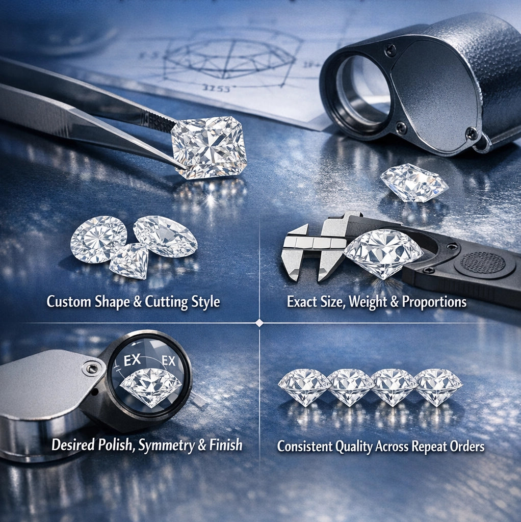 Whether you need a single custom-cut diamond or a repeat order with exact parameters, our process is designed around your standards: